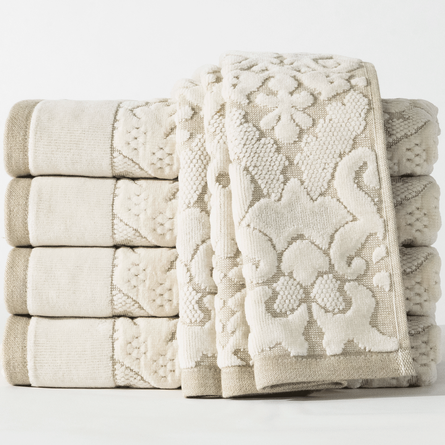 Woven from 95% cotton and 5% linen, the Calisto Towel features a velour finish and an understated jacquard pattern. A calm, natural tone that brings effortless elegance to your bathroom.