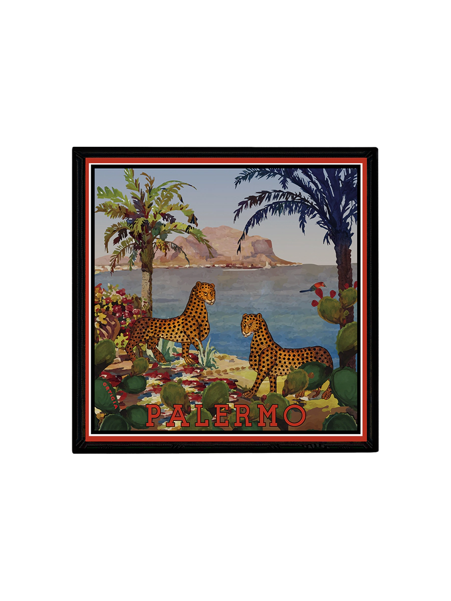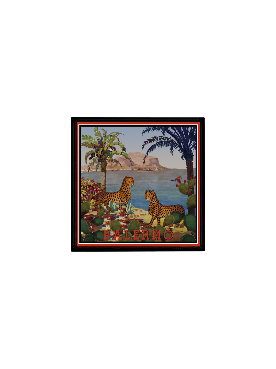 Inspired by the vibrant spirit of Sicily’s capital, the Palermo Tray captures a sun-drenched coastal scene framed by lush palms and Ortigia’s signature leopards. Hand-crafted and finished in lacquer, this striking piece blends artistry and elegance, making it a beautiful addition to any home — whether styled on a coffee table, dressing area, or used to elevate everyday rituals.